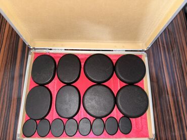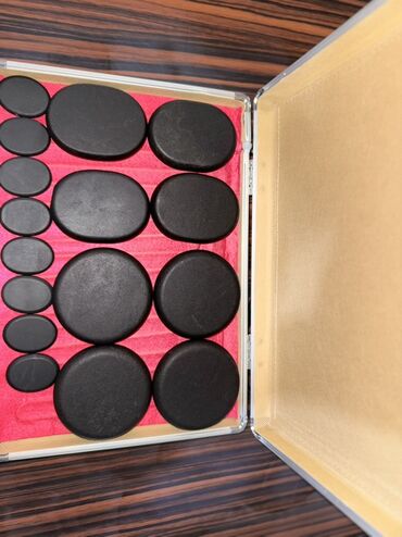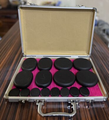 - Komplekt: alüminium çamadan içində çoxölçülü bazalt tipli hamarlanmış daşlar (bel, kürək, boyun, ayaq və əl üçün müxtəlif ölçülər)