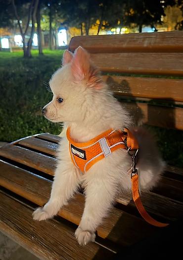 Cins: Pomeranian (Zwergspitz) Rəng: krem/ağ Ölçü: kiçik toy tipli Yaş: 2 aylıq Peyvəndi olunub. Tualet Tərbiyəsi var. Xüsusiyyətlər: - Yumşaq, həcmli ikiqat tüklü örtük; yuvarlaq “tülkü” üzü və qa...