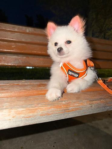 Pomeranian (Spitz) balası – ağ rəng, xırda ölçü, qalın və yumşaq tüklü. Üçbucaq formalı dik qulaqlar, qısa pofuduq quyruq, qara burun və ifadəli gözlər. Şəkillərdə narıncı rəngli “Fashion” markalı qoşqu və eyni rəngdə iynəsiz tasma ilə görünür.