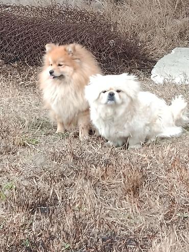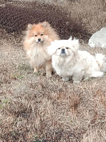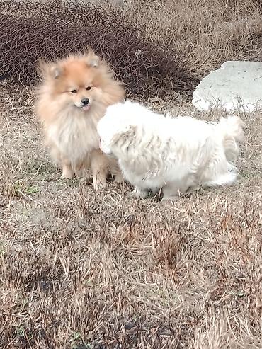 Pomeranian (ağzı qısa, tüklü narıncı) və kiçik ölçülü, uzun tüklü ağ it – cütlüyün fotoları.