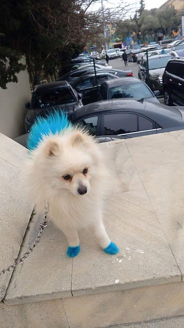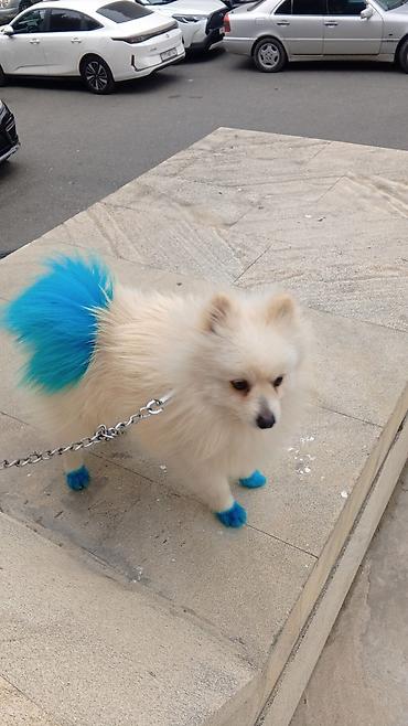 Pomeranian (Spitz) cinsi, krem-ağ rəngli, bəyaz tüklü balaca it. Quyruq tükləri və dörd pəncəsinin ucları parlaq mavi rənglə boyanıb, diqqətçəkən görünüş verir. Qısa burunlu, dik qulaqlı, sıx və yumuşaq xəz örtüyü var. Kiçik ölçülü, şəhər və mənzil şəraiti üçün uyğun cinsdir. Gəzinti üçün metal zəncirli qayışla göstərilir. Sosial, mehriban və aktiv xasiyyətli ümumi Pomeranian xüsusiyyətlərinə malikdır: sahibinə bağlı, oyuncaqları və oyunları sevir, tez öyrənir, gündəlik fırçalama ilə tük baxımı tələb edir. Rəngləmə effekti fotoşəkillərdə göründüyü kimidir; estetik məqsədlidir və itə fərqli obraz qazandırır.