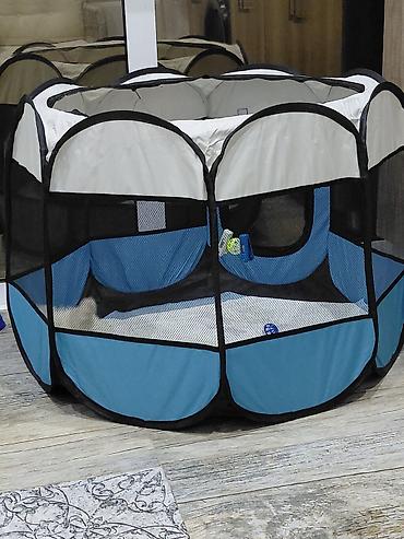 - Aksesuar: yığılan mesh panelli, çoxbucaqlı forma it manesi/playpen göstərilir (hava keçirmə qabiliyyətli tor panellər, giriş pəncərəsi, yüngül konstruksiya; evdə məkan məhdudlaşdırma və təhlükəsiz oyun üçün rahatdır)