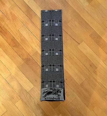 - Boz naxışlı şərf: boz-qaranlıq tonlarda qrafik naxış, bir ucunda atlı fiqur və “Burberry” yazısı, hamar uclar.
