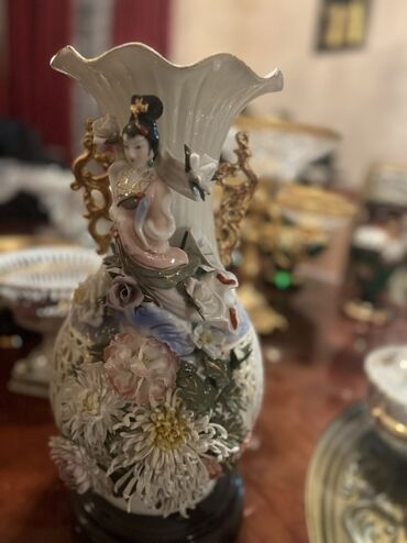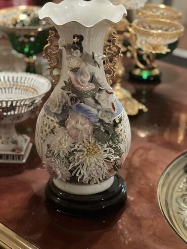 Zərif dekorativ vaza - Material: porselen/keramika - Rənglər: ağ əsas, parlaq qızılı naxışlar - Bəzək: əllə işlənmiş çiçək motivləri (yaşıl yarpaqlar, ağ-göy çiçəklər), relief qızılı ornamentlər v...