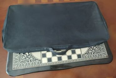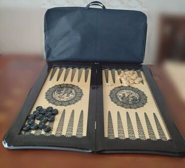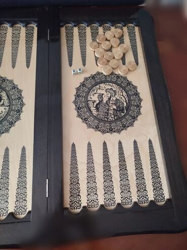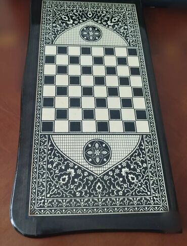 Ağ-qara şərq naxışları ilə bəzədilmiş taxta nərd-şahmat dəsti.