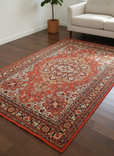 Xalça – klassik oriental naxışlı - Rəng palitrası: tünd narıncı (terrakota) fon, krem və tünd qəhvəyi haşiyələr, zeytun və bej tonlarda motivlər - Dizayn: mərkəzi medalyonlu kompozisiya, dörd künc...