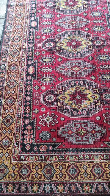 - Rəng palitrası: tünd qırmızı fon, sarı-qızılı, boz, qara və krem tonlarında kontrast naxışlar.