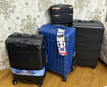- Ölçülər: şəkillərdə L ölçülü iri çamadan, M ölçülü orta çamadan, S ölçülü kabin ölçüsü və üstə əlavə kosmetik/aksesuar çantası.