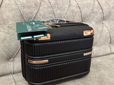 - Kosmetik/aksesuar çantası: sərt korpus, ikiqat bölmə, fermuarlı, qızılı rəng detalları; pasport, elektronika və kosmetika üçün rahat həcm.