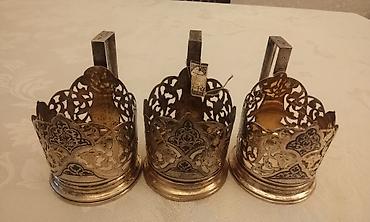 Podstakannik подстаканник stəkan altlığı Sovet istehsalı stəkan altlıqları satılır, yaxşı vəziyyətdədir. Materialı melxior (paslanmır), dəstində 5 ədədir, müştərilərin istəyinə görə tək-tək almaq o...