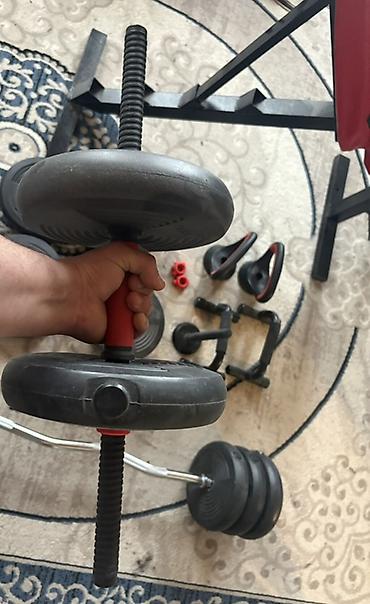 Tənzimlənən ştanq və dambıl dəsti - Komplekt: 1 ədəd xrom ştanq (birləşdirilən boru), 2 ədəd dambıl qolu, 4 ədəd spiral kilid, müxtəlif çəkili dəmir disk lövhələri - Disklər: şəkillərdə görünən me...Razılaşma yolu ilə
