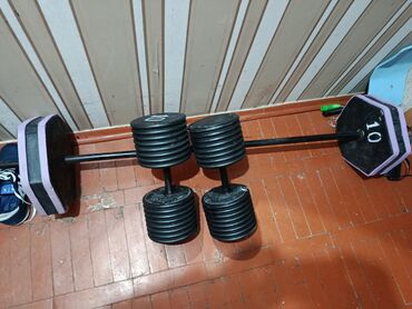 OBŞİ 143 Kq ştanq, disklər və girya - Ştanq: tam uzun ox, klassik düz bar. Qollarda qara örtük. - Disklər: metal, dairəvi. Üzərində “SPORT”/“TS” yazıları görünür. Çoxlu disk komplekti ilə yığılmışd...