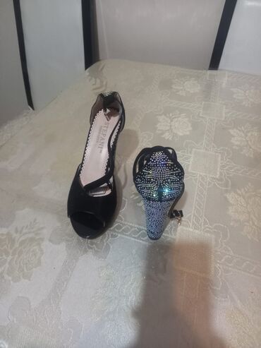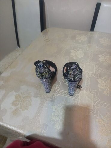 95 manata alinib 2 defe geynilolib. 38-39 razmere gedir Qadın ayakkabısı – zərif, daşla bəzədilmiş - Rəng: qara - Model: sivri burunlu, açıq daban (slingback) - Parıltılı tekstura üzərində gümüşü ...