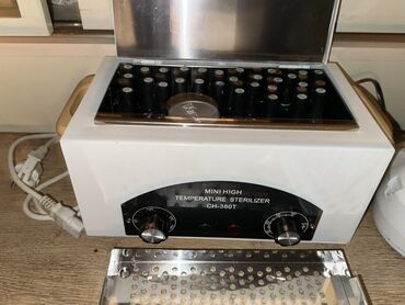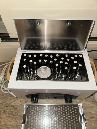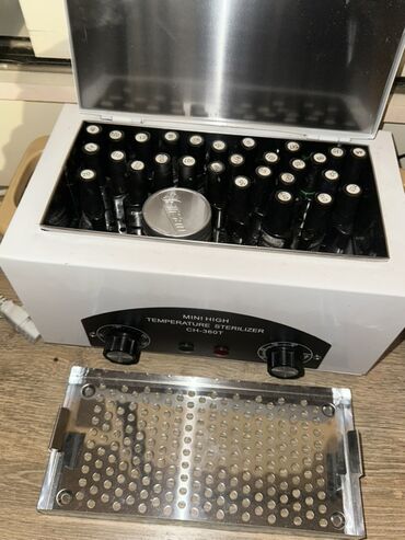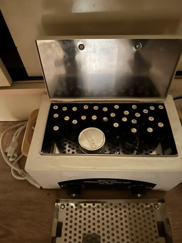- Quru istilik sterilizatoru (Mini High Temperature Sterilizer): metal daxili kamera, perforasiya olunmuş səth, yuxarıdan açılan qapaq, temperatur və vaxt tənzimləyici düymələr, göstərici işıqları. Alətlər üçün metal səbət və qapaq daxilindədir.