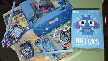 - Bütün məhsullar Stitch mövzulu, mavi tonlarda dizayn