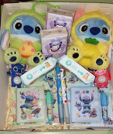 Stitch temalı hədiyyə qutusu – uşaq və yeniyetmələr üçün rəngarəng dəftərxana və oyuncaqlar dəsti.