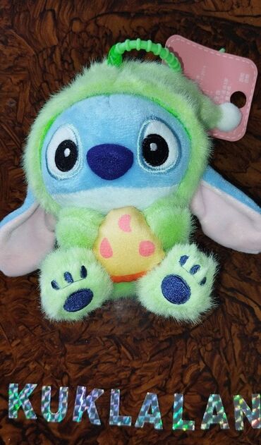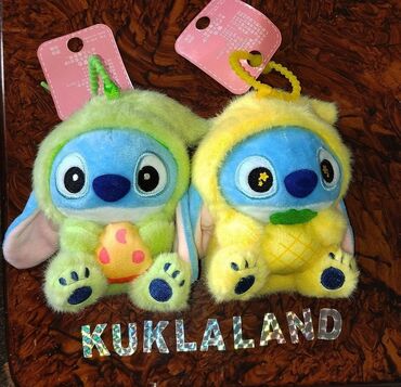 - Yumşaq plyuş oyuncaqlar: müxtəlif versiyalar. Mavi Stitch fiquru, eləcə də meyvə motivli geyimdə iki variant – ananas və göbələk saxlayan, başında tüklü kapüşonlu dizayn. Hər birinin iri parlaq gözləri, uzun qulaqları və naxışlı pəncə detalları var. Bəzilərində üst hissədə asma üçün elastik/plastik ilgək mövcuddur – çanta bəzəyi və ya açarlıq kimi istifadə oluna bilər.