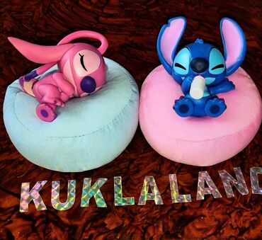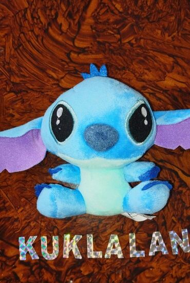 Kolleksiya və hədiyyəlik üçün rəngarəng, toxunuşa xoş Stitch temalı oyuncaqlar və dekorlar. KUKLALAND yazılı fonda təqdim olunub.