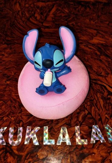 - Mini fiqurlar: yumşaq puf otaqçıq yastığının üzərində iki balaca kompozisiya – mavi Stitch butulka ilə, çəhrayı xarakter isə yatmış vəziyyətdə. Dekorativ vitrin və ya stolüstü bəzək üçün uyğundur.