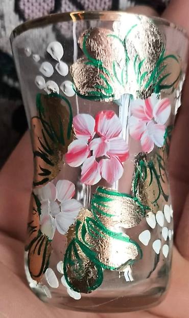 - Rəngli əl naxışlı mini stəkan: Şəffaf şüşə üzərində əl işi çiçək rəsmləri (ağ-çəhrayı ləçəklər, yaşıl yarpaq konturları), üst kənarda qızılı xətt. Dekorativ süfrələr və likör/araq porsiyaları üçün uyğundur.