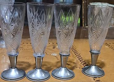 - Metal əsaslı kəsim naxışlı şampan flütləri (4 ədəd): Konus formalı şüşə kasa, gövdəsi kəsim ulduz və romb ornamentləri ilə, alt hissəsi metal ayaq-əsasla möhkəmləndirilmiş. Bayram süfrələri üçün zərif görünüş.