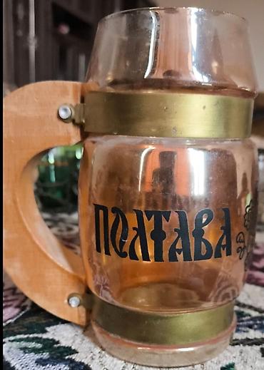 - “Полтава” yazılı krujka: Şüşə gövdə, taxta qulplu və pirinç rəngli halqalarla bərkidilmiş dizayn. Koleksiya və tematik servis üçün fərqli suvenir üslubu.