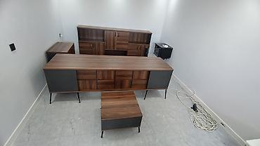 Direktor kabinet dəsti – müasir ofis üçün tam komplekt kreslolar qiymete daxil deyil!!! Tərkib: kreslolar daxil deyil - Geniş iş masası: taxta teksturalı (ceviz tonları), ön hissədə metalik zola...