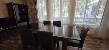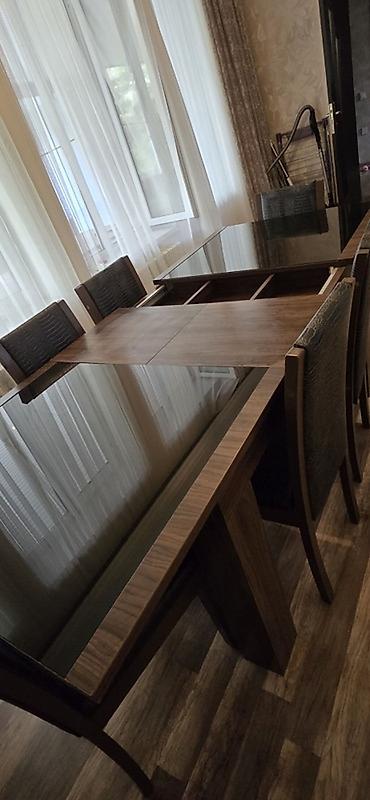 - Yemək masası və 6 ədəd stul: düzbucaqlı masa, ağac fakturalı karkas, üstü qara şüşə ilə örtülü; stullar uyğun tərzdə, arxalıqlı.
