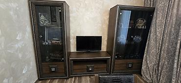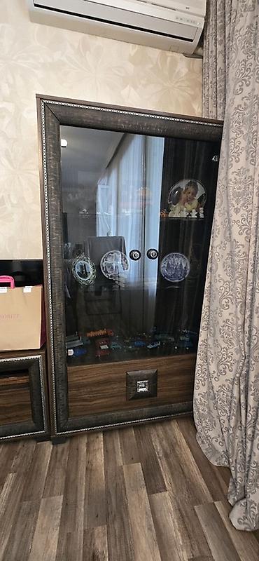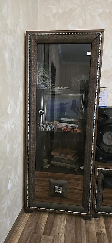 - 2 ədəd vitrin şkafı: tünd qəhvəyi ağac teksturası, şüşə qapı, dekorativ çərçivə və aşağı hissədə qapaqlı bölmə. Daxildə bir neçə rəf – kitab, suvenir və qab-qacaq üçün uyğundur.