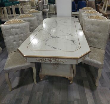Stol stul dəstləri masa destleri Yemək otağı dəsti – masa və 6 stul - Klassik üslubda, zərif qızılı naxışlarla işlənmiş dik dayaq ayaqlı masa - Parıltılı/mermər effekti verən üst səth, yumru küncl...