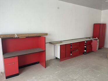 - Laboratoriya/sterilizasiya zonası üçün qırmızı rəngli mebel komplekti: uzun iş masası-lavabo bölməsi olan modullar, çoxsaylı çekmecə və şkaflar, ayrıca iş stolu və hündür dolab.