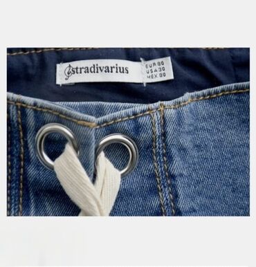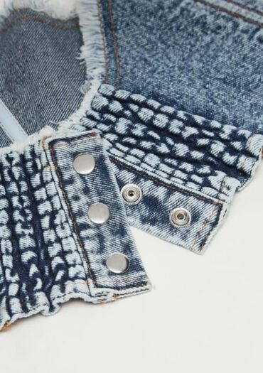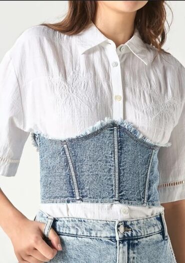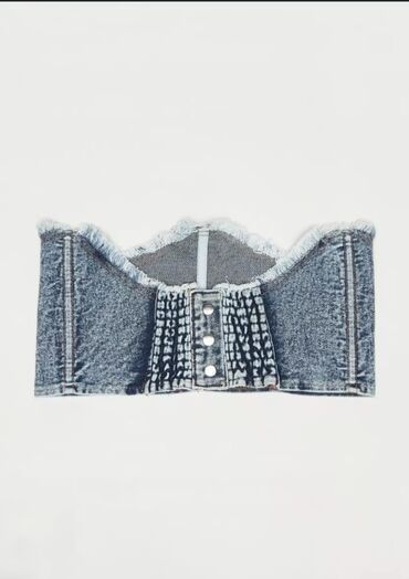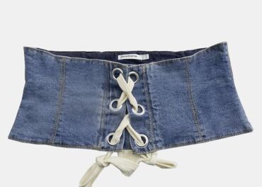 - Material: mavi denim (cins), ön hissədə metal halqalar və qalın krem rəngli iplə bağlama