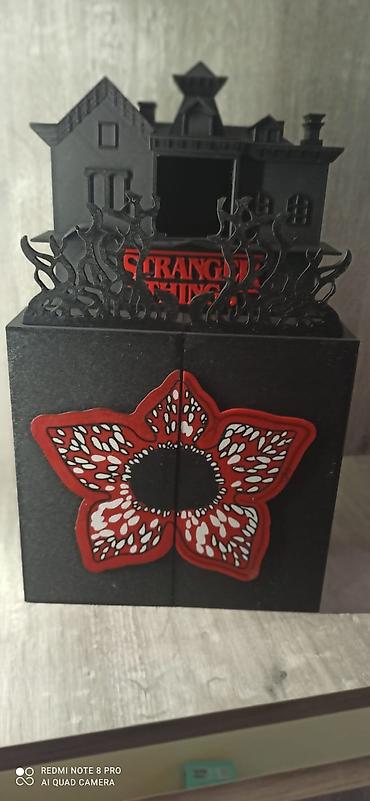 - Serialdan ilhamlanan dizayn: üst hissədə qorxulu ev silueti və “Stranger Things” loqosu, ön qapaqda Demogorgon çiçəyi motivi.