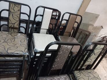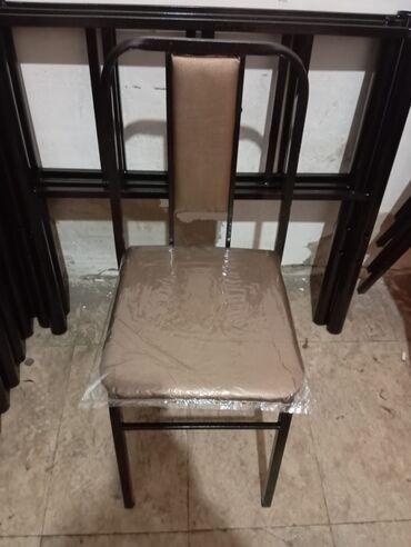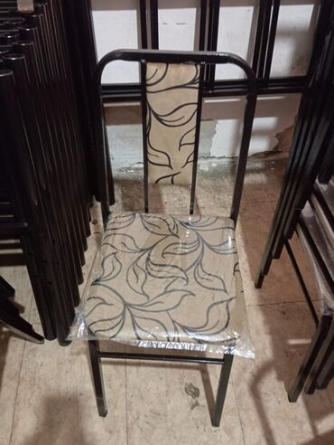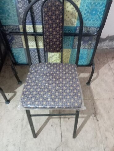 Qara metal çərçivəli, bənövşəyi rəngli oturacağı və kürəyi olan yeni stul. Stul, oturacağı və kürəyi üzərində naxışlı parçası ilə zərif görünüşə malikdir. Qonaq otağı, mətbəx və ya ofis kimi müxtəl...