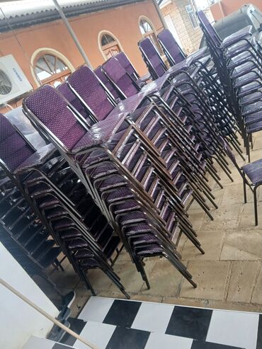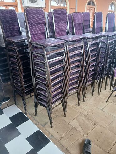 Qara metal çərçivəli, bənövşəyi rəngli oturacağı və kürəyi olan yeni stul. Stul, oturacağı və kürəyi üzərində naxışlı parçası ilə zərif görünüşə malikdir. Qonaq otağı, mətbəx və ya ofis kimi müxtəl...