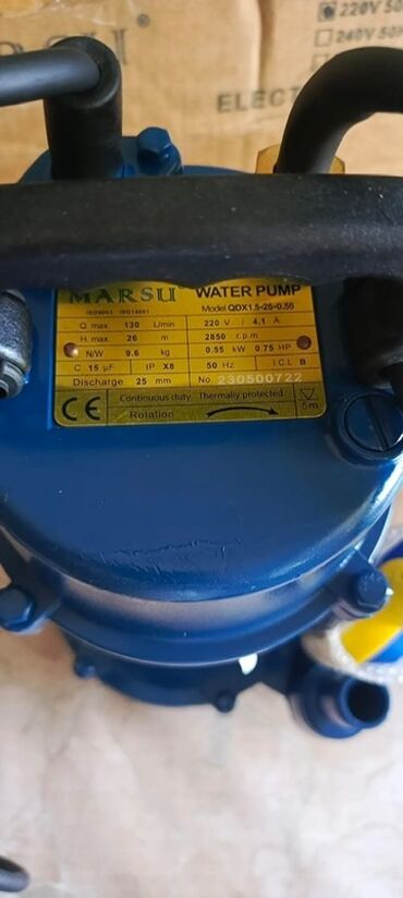 MARSU markalı elektrik su nasosu, model QDX1.5-25-0.55. Maksimum 130 litr/dəqiqə su axınına malikdir. 220V gərginliklə işləyir və 0.55 kW gücə malikdir. Sürekli işləməyə uyğundur və termal qorunmaya malikdir. Su axını diametri 25 mm-dir.