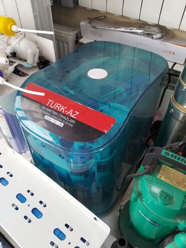 - Su təmizləmə avadanlıqları dəsti. Şəkillərdə iki mərhələli korpus tipli mexaniki/karbon önfiltr bloku və kabinet tip “TURK-AZ” markalı Reverse Osmosis (RO) sistemi görünür.