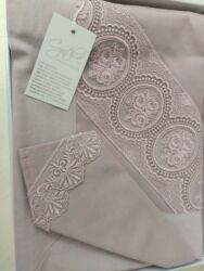 - Dizayn: süfrənin üzərində geniş zolaq şəklində zərif güllü krujeva/naxış işləmələri; salfetlərin künclərində uyğun krujeva detalları