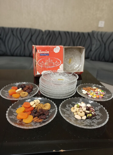- Şüşə desert boşqabları dəsti: Isfahan Glass – Simin seriyası. Şəffaf, çiçək relyefli naxışlı, dairəvi forma. Qutuda təqdim olunur. Bir neçə ədəd yığımdadır.
