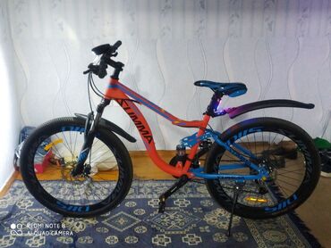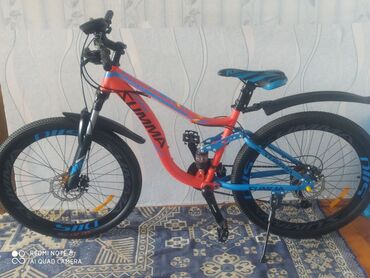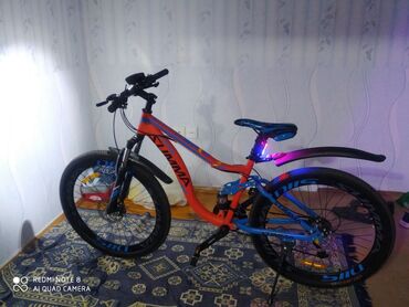 Dağ velosipedi – 26” təkərlər, disk əyləclər, amortizatorlu ön “fork”. - Çərçivə: yüngül və möhkəm alüminium tipli çərçivə, qara rəngdə mavi-qırmızı detallar. - Təkərlər: 26 düym dişli (off-road) ...