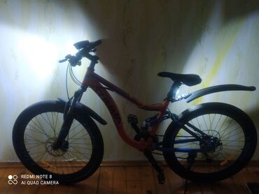 Dağ/şəhər tipli velosiped - Çərçivə: amortizatorlu (arxa yaylı), alüminium/metal konstruksiya, qırmızı-qara rəng sxemi - Asqı sistemi: ön amortizator vilkası, arxa yay - Təkərlər: 26" ölçülü - Ört...