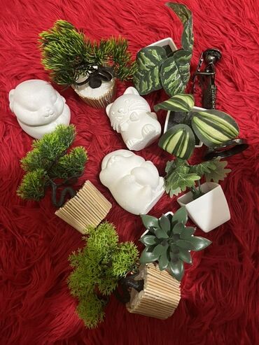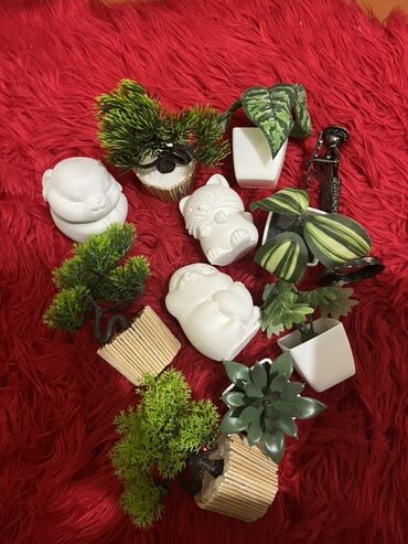 Dekorativ süni güllər dəsti - Müxtəlif kompozisiyalar: - Ağ kvadrat saksıda açıq krem rəngli güllər - Ağ vaza içində yaşıl-ağ çiçək buketi - Çəhrayı miniatür velosiped formalı saksıda ...