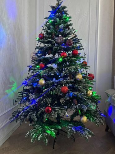 Süni Yeni il şam ağacı - Material: PVC iynəciklər, qar effektli uclar - Rəng: tünd yaşıl, ağ “qar” vurğuları - Hündürlük: təxmini 1.8–2.0 m (şəkilə əsasən tam ölçülü otaq ağacı) - Konstruksiya: me...