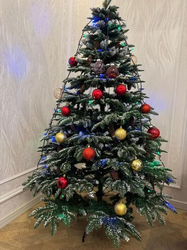 Məhsul: Bəzədilmiş süni Yeni il şam ağacı Xüsusiyyətlər: - Hündürlük təxmini 1,8–2,0 m (otaq ölçüsündə, geniş budaqlı) - Sıx, iynəyarpaqlı süni budaqlar, qar effekti olan şişəciklərlə - Üst hissəd...