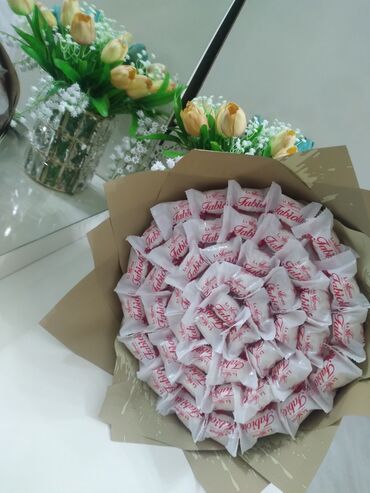 Gul püketi isdeyenler elaqa saxlaya bilerler şekildeki gül püketi al beni şakaladı ile bezedilib güleri sabun güldü iri hecimli puketdi 35m isdeyen buyursun