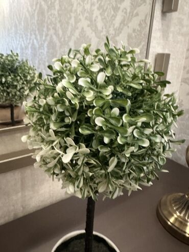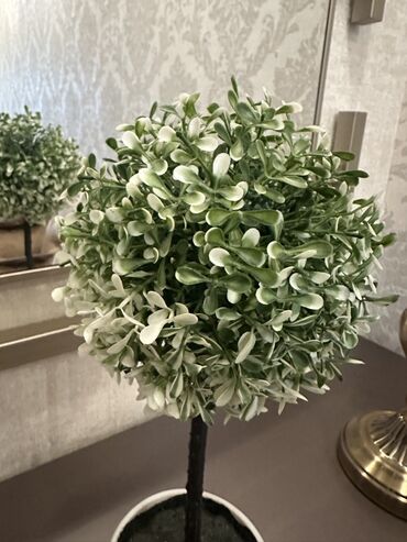 - Realistik görünüşlü süni topiar: qara gövdə üzərində şar formalı, sıx yarpaqlı başlıq