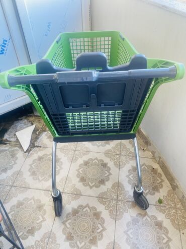Mağaza/supermarket üçün alış-veriş arabası Xüsusiyyətlər: - Material: möhkəm plastik səbət və metal karkas - Rəng: qara gövdə, yaşıl detallarla - Həndəsi naxışlı havalandırılan səbət – yuyulması v...