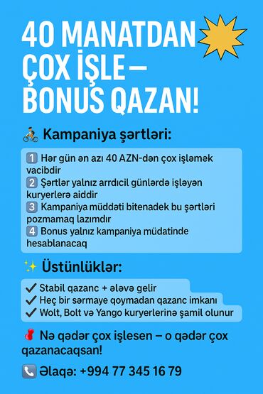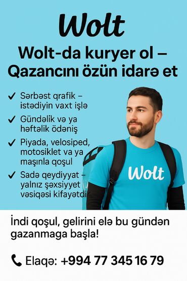 Wolt çatdırılma parkımıza yeni kuryerlər axtarılır! 🚗 Maşın, 🛵 motosiklet, 🚲 velosiped, elektrik velosiped Qeydiyyat 1 iş günü ərzində Hüquqi dəstək YPX 🚓 Sərbəst iş qrafiki 💸 Ödənişdə gecikmə ol...