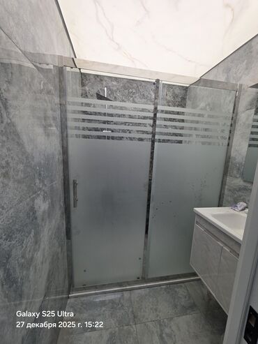 - Dizayn: boz mərmər effekti ilə uyğunlaşan minimalistik xrom profillər; məxfiliyi artıran yarımat şüşə