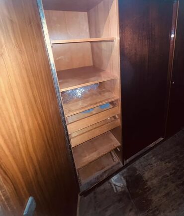 - Raflı bölmə: yuxarıda 2 sabit rəf, aşağı hissədə bir neçə dayaz taxta çekmece tipli səbət/raf (köynək, dəsmal, aksesuar üçün əlverişli), ən altda əlavə geniş rəf